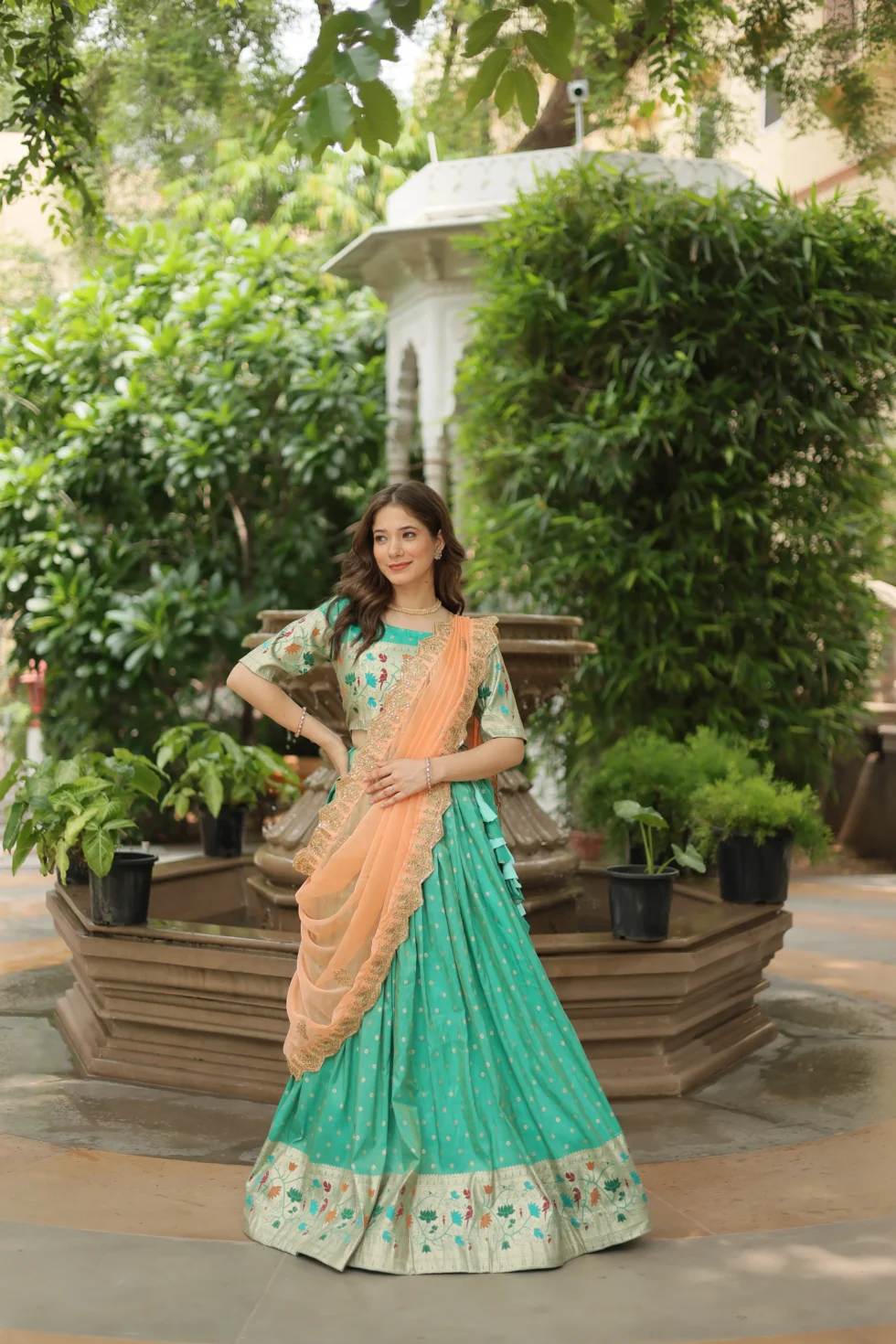 Step into elegance with this trending Cosmos Jequard Lehenga Choli paired with a Russian silk embroidered dupatta, perfect for festive occasions, weddings, and special celebrations.