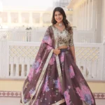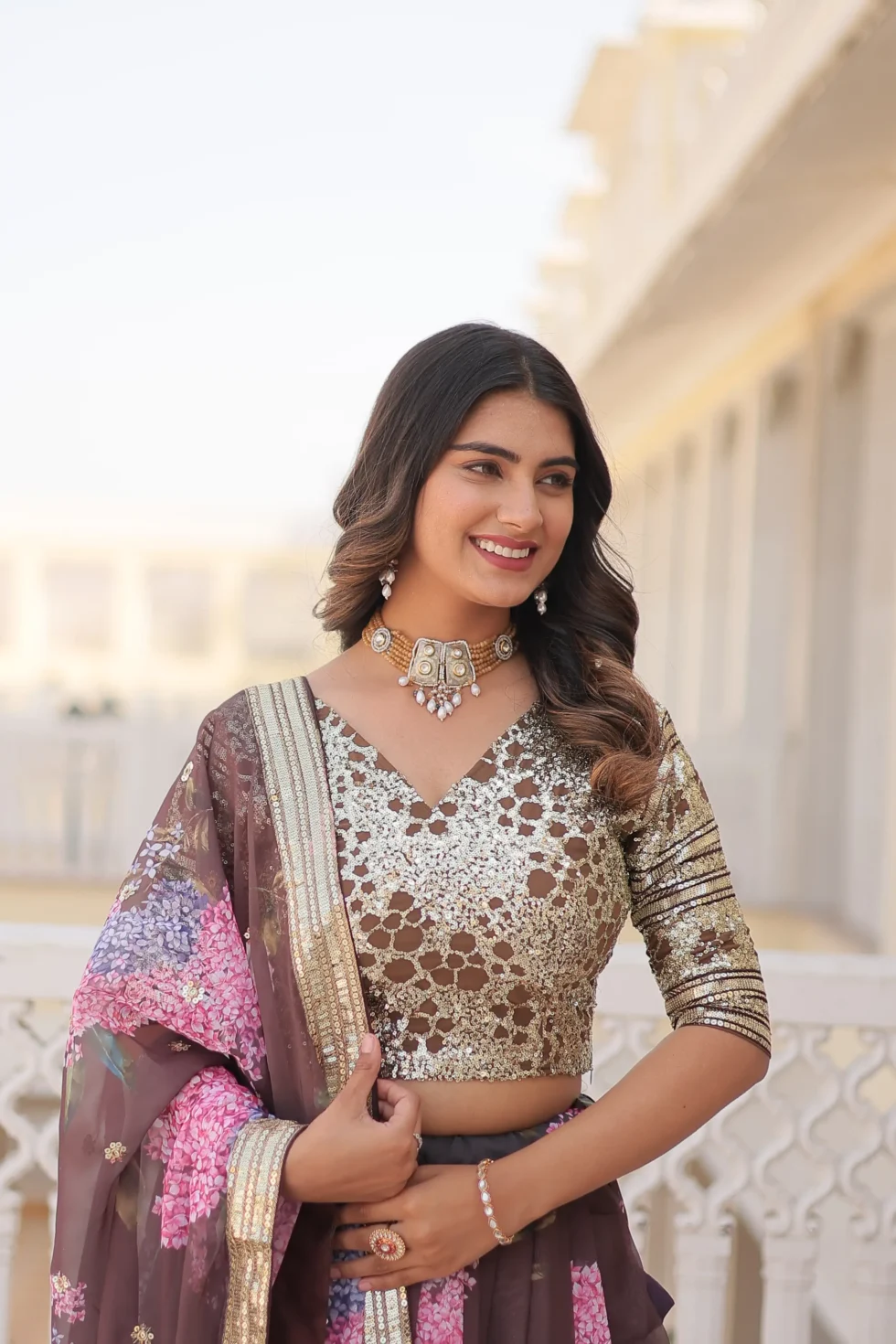 Step into elegance with this fully flaired designer lehenga choli set, crafted from digital printed Russian silk and paired with a rich sequins embroidered blouse and matching designer dupatta. Perfect for festive occasions and parties.