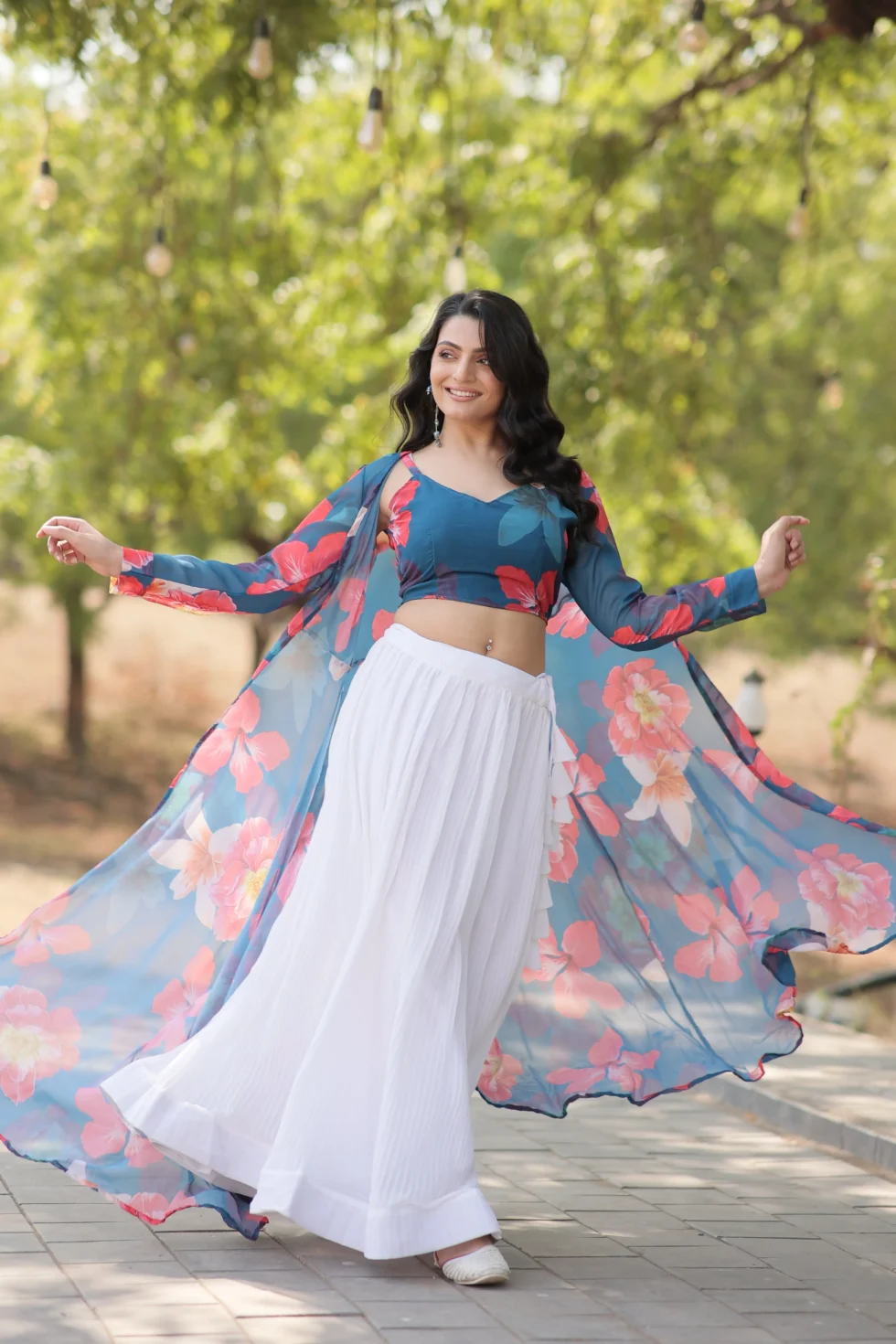 Completing the ensemble is a matching shrug, crafted from faux georgette with digital flower print, designed with the same flair and pattern as the lehenga, adding a contemporary layered look.