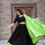 Available in two vibrant shades – Maroon & Parrot Green, this 1.7 KG lightweight ensemble is ideal for Garba, Dandiya, and traditional celebrations.