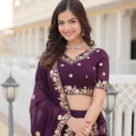 Turn heads in this stunning wine faux blooming georgette lehenga choli set, featuring rich thread and sequins embroidery, a fully flaired lehenga, and an elegant dupatta with embroidered lace border.